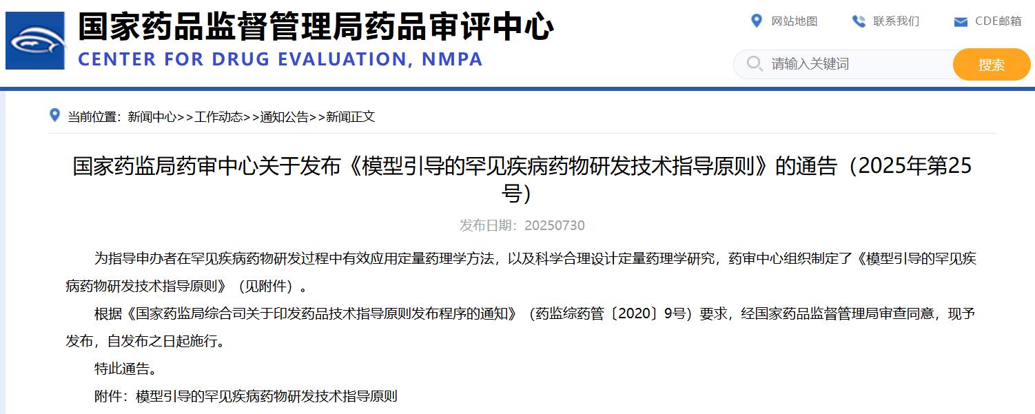 國(guó)家藥監(jiān)局藥審中心關(guān)于發(fā)布《模型引導(dǎo)的罕見疾病藥物研發(fā)技術(shù)指導(dǎo)原則》的通告(2025年第25號(hào))
