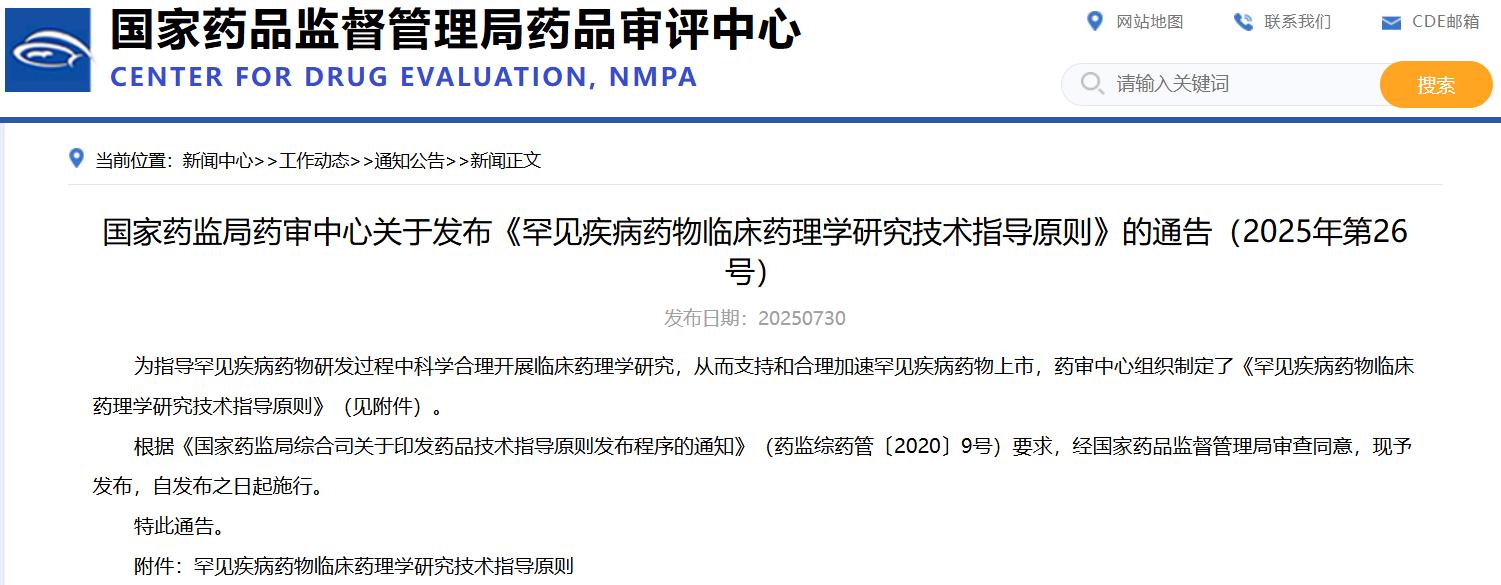 國(guó)家藥監(jiān)局藥審中心關(guān)于發(fā)布《罕見疾病藥物臨床藥理學(xué)研究技術(shù)指導(dǎo)原則》的通告(2025年第26號(hào))