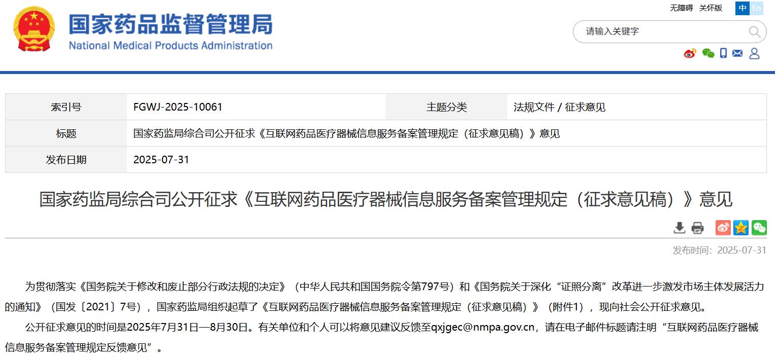 國(guó)家藥監(jiān)局綜合司公開征求《互聯(lián)網(wǎng)藥品醫(yī)療器械信息服務(wù)備案管理規(guī)定(征求意見稿)》意見