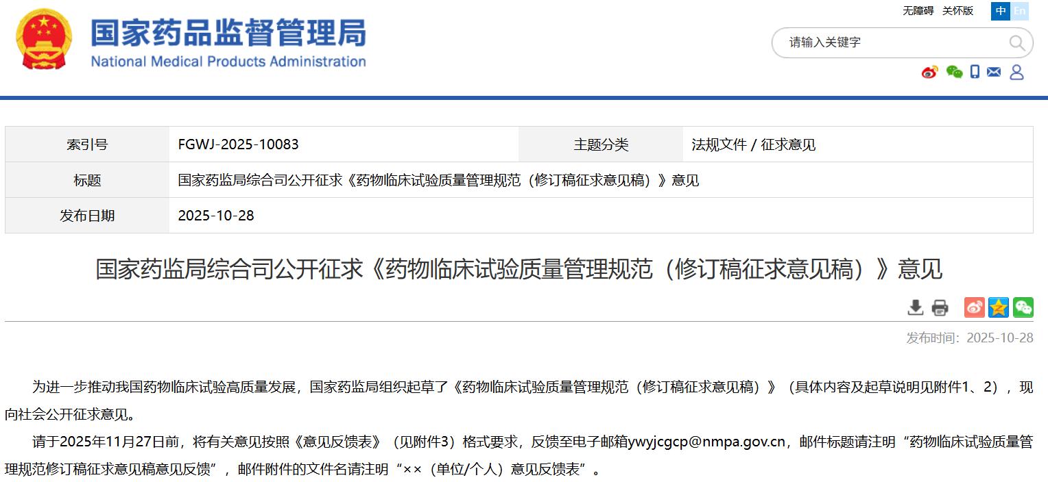 國家藥監(jiān)局綜合司公開征求《藥物臨床試驗質(zhì)量管理規(guī)范(修訂稿征求意見稿)》意見