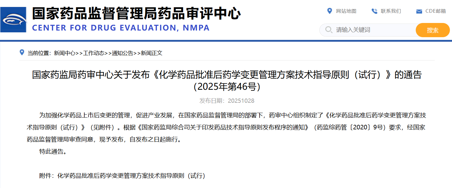 國家藥監(jiān)局藥審中心關于發(fā)布《化學藥品批準后藥學變更管理方案技術指導原則(試行)》的通告(2025年第46號)