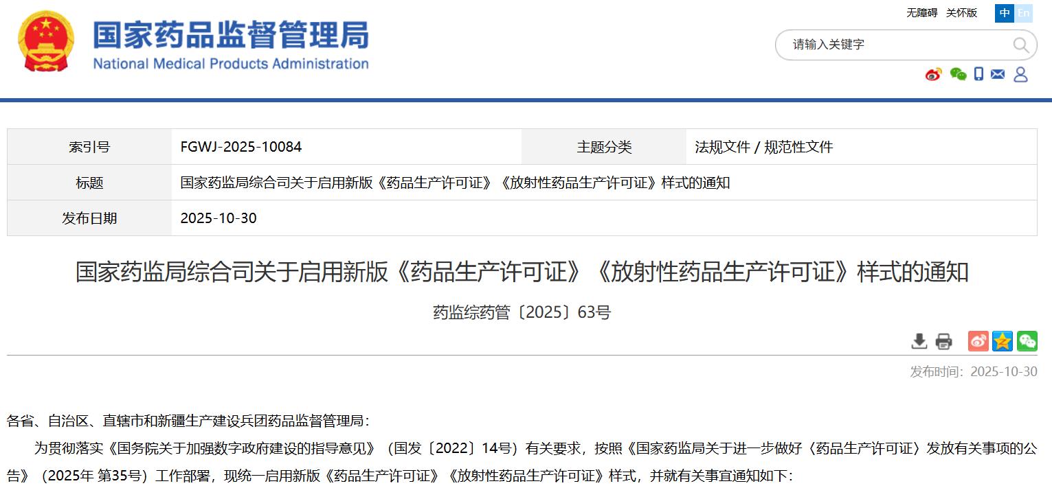 國家藥監(jiān)局綜合司關于啟用新版《藥品生產(chǎn)許可證》《放射性藥品生產(chǎn)許可證》樣式的通知