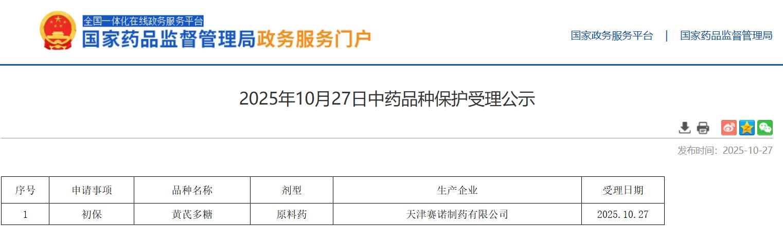 2025年10月27日中藥品種保護受理公示
