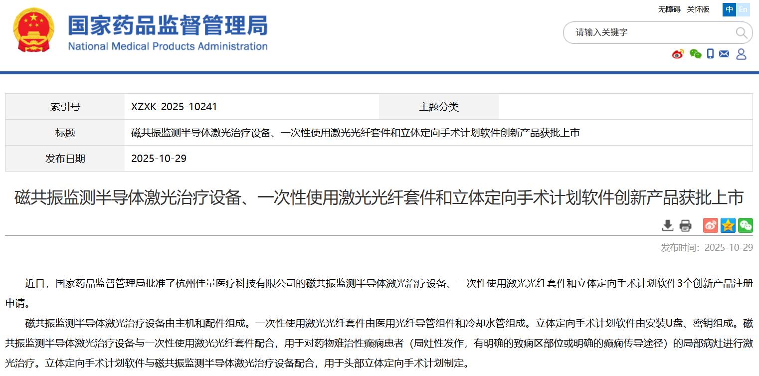 磁共振監(jiān)測半導體激光治療設備、一次性使用激光光纖套件和立體定向手術計劃軟件創(chuàng)新產(chǎn)品獲批上市
