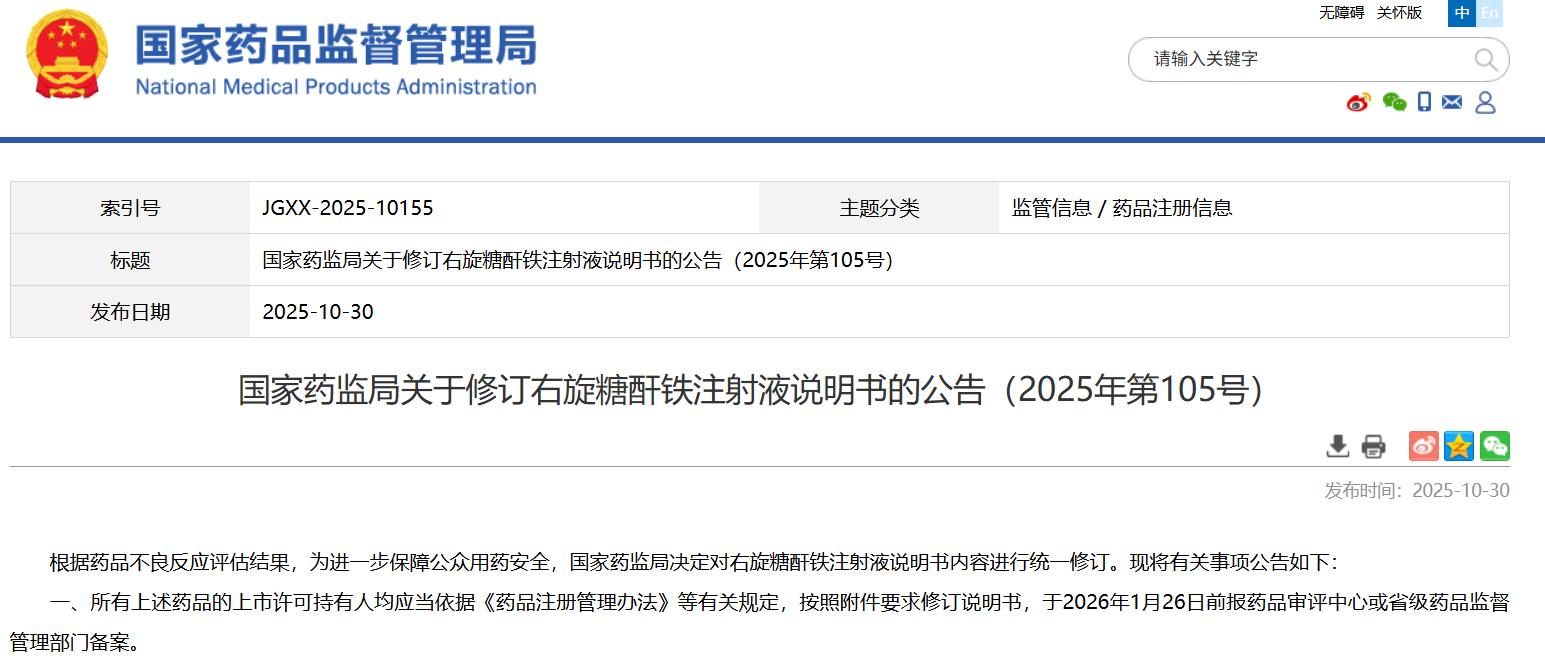 國家藥監(jiān)局關于修訂右旋糖酐鐵注射液說明書的公告(2025年第105號)
