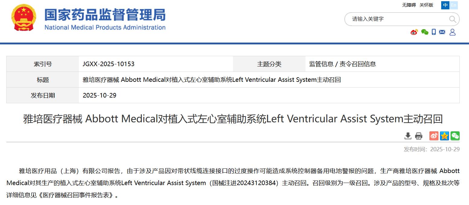 雅培醫(yī)療器械 Abbott Medical對植入式左心室輔助系統(tǒng)Left Ventricular Assist System主動召回