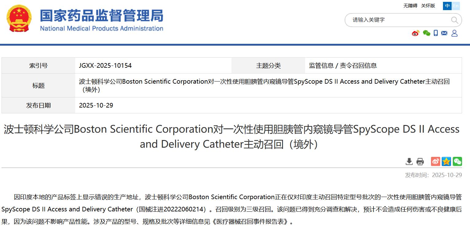 波士頓科學公司Boston Scientific Corporation對一次性使用膽胰管內(nèi)窺鏡導管SpyScope DS II Access and Delivery Catheter主動召回(境外)