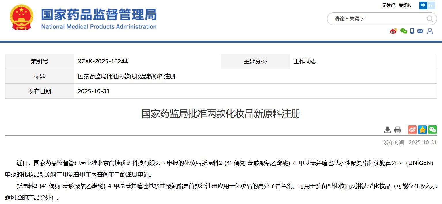 國家藥監(jiān)局批準兩款化妝品新原料注冊