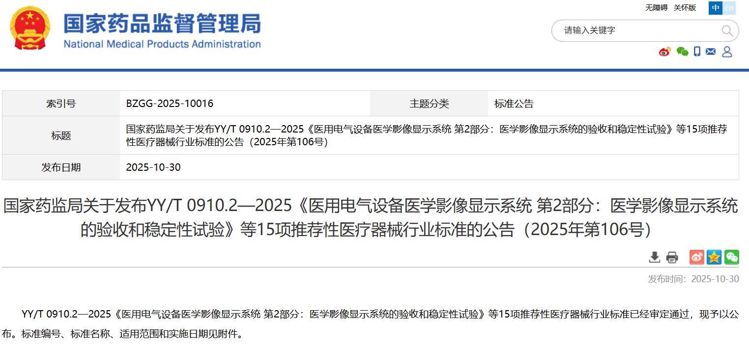 國家藥監(jiān)局關于發(fā)布YY/T 0910.2—2025《醫(yī)用電氣設備醫(yī)學影像顯示系統(tǒng) 第2部分:醫(yī)學影像顯示系統(tǒng)的驗收和穩(wěn)定性試驗》等15項推薦性醫(yī)療器械行業(yè)標準的公告(2025年第106號)