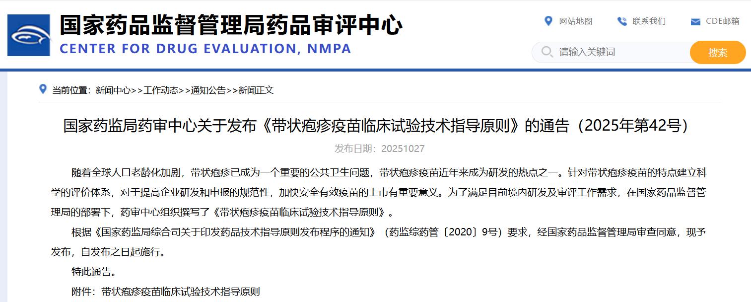國家藥監(jiān)局藥審中心關于發(fā)布《帶狀皰疹疫苗臨床試驗技術指導原則》的通告(2025年第42號)