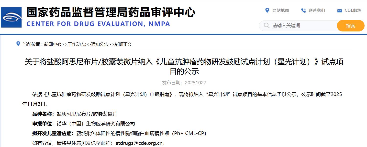 關于將鹽酸阿思尼布片/膠囊裝微片納入《兒童抗腫瘤藥物研發(fā)鼓勵試點計劃(星光計劃)》試點項目的公示