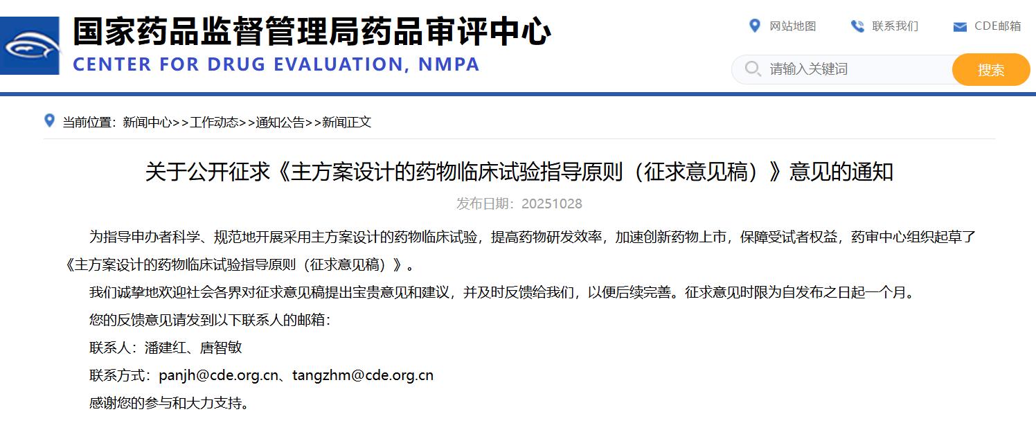 關于公開征求《主方案設計的藥物臨床試驗指導原則(征求意見稿)》意見的通知