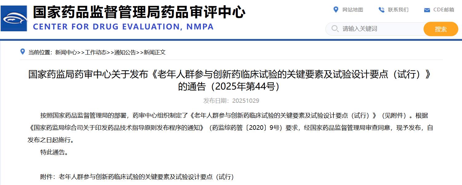 國家藥監(jiān)局藥審中心關于發(fā)布《老年人群參與創(chuàng)新藥臨床試驗的關鍵要素及試驗設計要點(試行)》的通告(2025年第44號)
