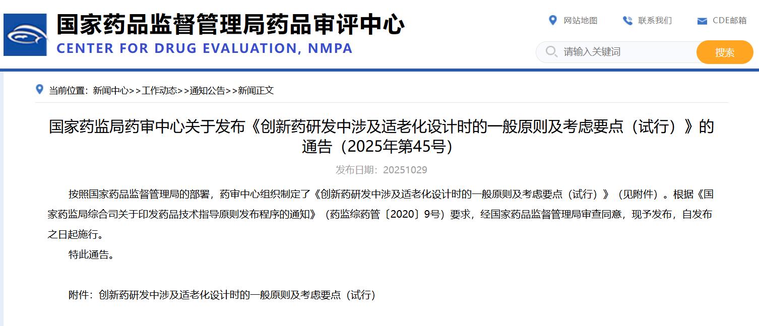 國家藥監(jiān)局藥審中心關于發(fā)布《創(chuàng)新藥研發(fā)中涉及適老化設計時的一般原則及考慮要點(試行)》的通告(2025年第45號)