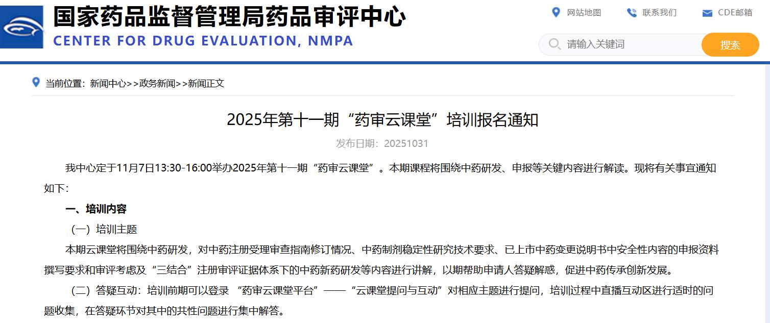 2025年第十一期“藥審云課堂”培訓報名通知