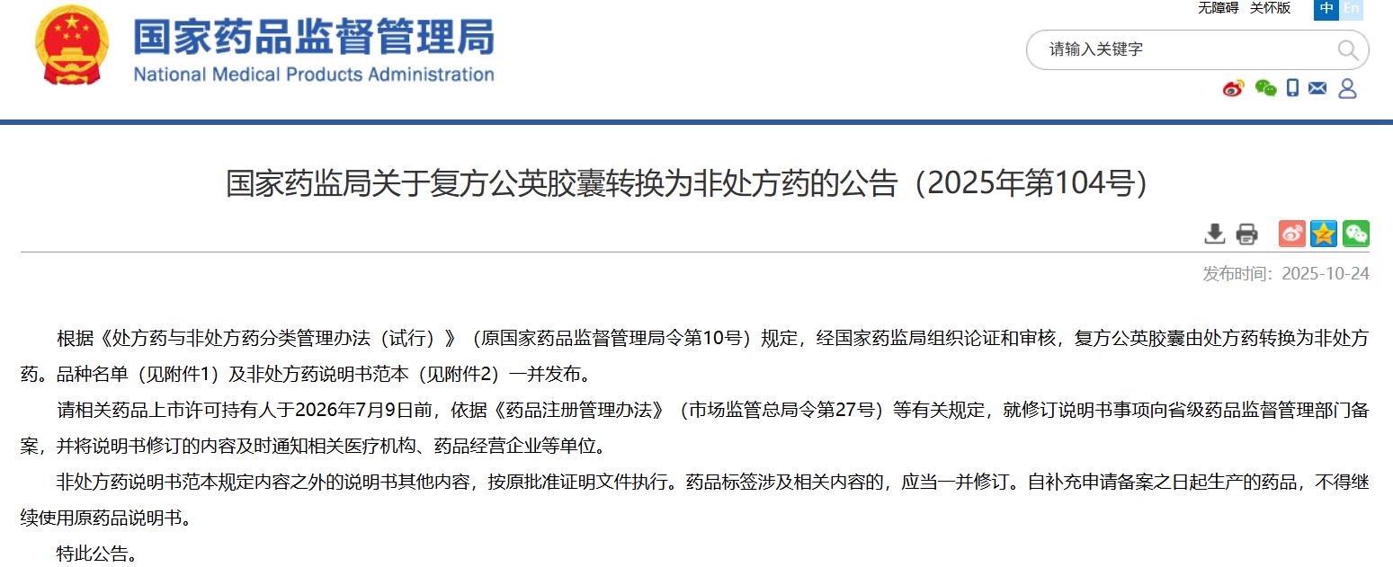 國家藥監(jiān)局關于復方公英膠囊轉(zhuǎn)換為非處方藥的公告(2025年第104號)