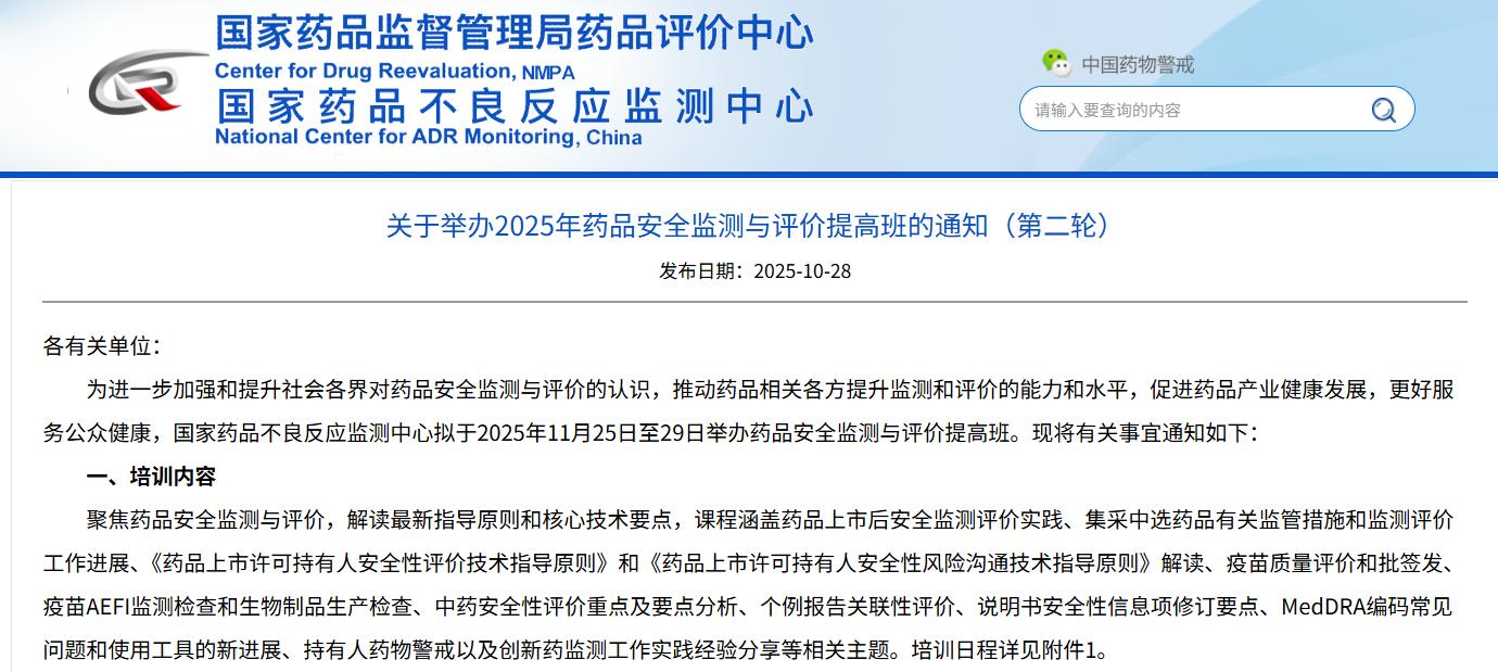 關于舉辦2025年藥品安全監(jiān)測與評價提高班的通知(第二輪)