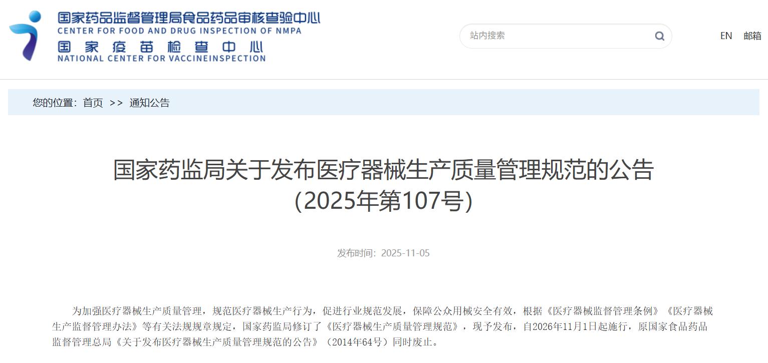 國家藥監(jiān)局關于發(fā)布醫(yī)療器械生產質量管理規(guī)范的公告(2025年第107號)