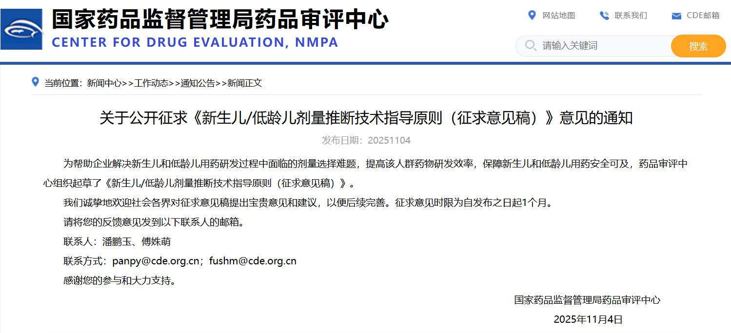 關于公開征求《新生兒/低齡兒劑量推斷技術指導原則(征求意見稿)》意見的通知