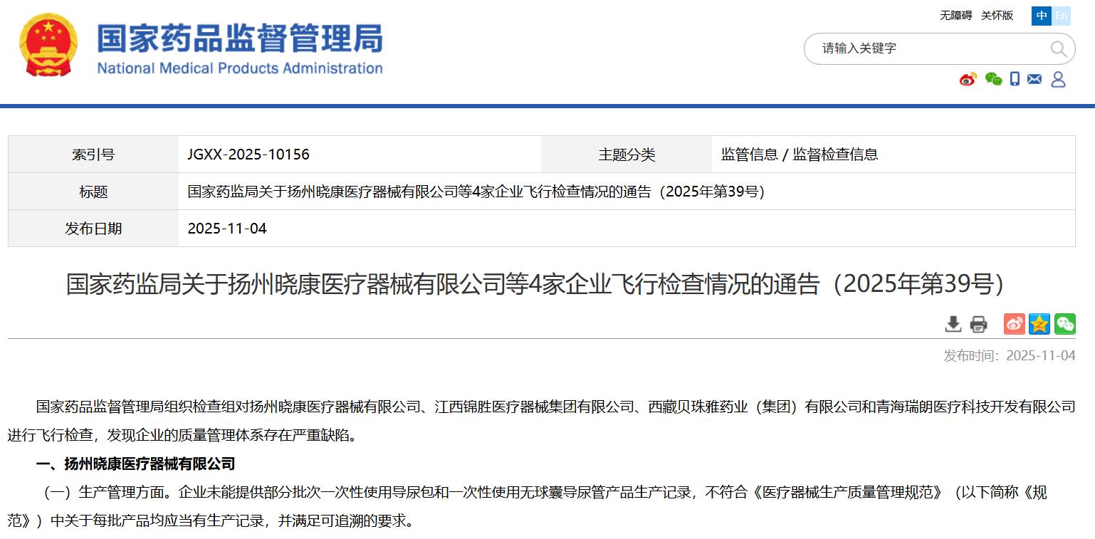 國家藥監(jiān)局關于揚州曉康醫(yī)療器械有限公司等4家企業(yè)飛行檢查情況的通告(2025年第39號)