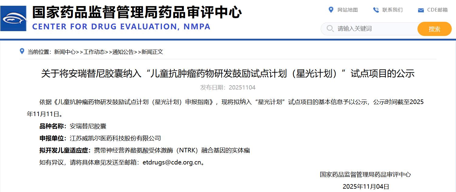 關于將安瑞替尼膠囊納入“兒童抗腫瘤藥物研發(fā)鼓勵試點計劃(星光計劃)”試點項目的公示