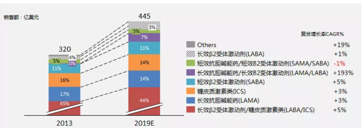 在市場(chǎng)方面,IQVIA報(bào)告顯示,2019年全球吸入制劑的市場(chǎng)份額高達(dá)480億美元,6年復(fù)合增長(zhǎng)率為+6.99%。全球吸入制劑藥物的應(yīng)用場(chǎng)景,主要來自支氣管哮喘Asthma/慢阻肺COPD的防治(約93%市場(chǎng)份額)、肺動(dòng)脈高壓治療,以及吸入麻醉及咳嗽的運(yùn)用。