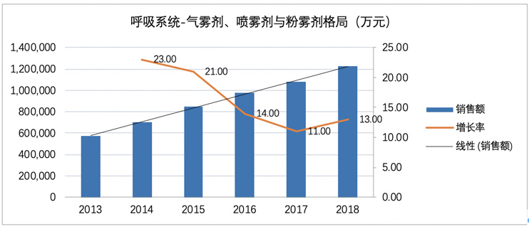 中國(guó)城市公立醫(yī)院統(tǒng)計(jì),2018年國(guó)內(nèi)氣霧劑、噴霧劑和粉霧劑市場(chǎng)容量為122億元,近5年復(fù)合增長(zhǎng)率(GAGR)高達(dá)+16.38%。