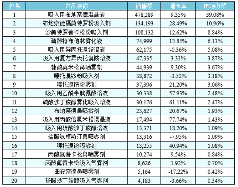 中國(guó)市場(chǎng)呈現(xiàn)不同的情況,據(jù)中國(guó)城市公立醫(yī)院統(tǒng)計(jì),2018年呼吸系統(tǒng)用藥之氣霧劑、噴霧劑與粉霧劑產(chǎn)品名稱TOP20格局(下表所示)中霧化溶液占62%的市場(chǎng),粉霧劑占25%,氣霧劑只占2%不到,說明中國(guó)吸入制劑市場(chǎng)具有其內(nèi)在的特點(diǎn),其中霧化吸入溶液代表產(chǎn)品在國(guó)內(nèi)均呈增長(zhǎng)趨勢(shì)。