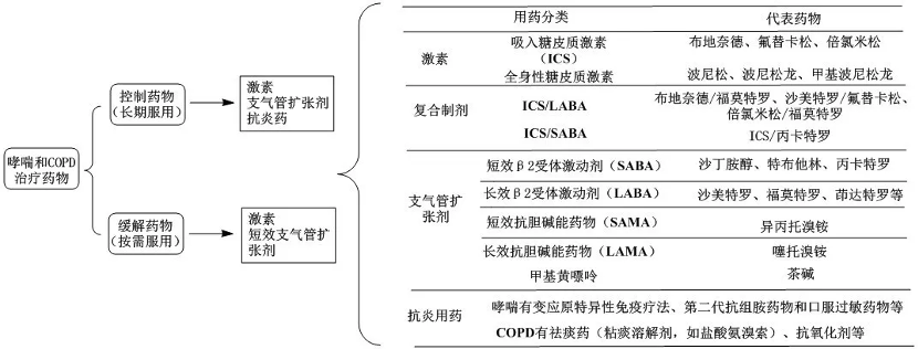 中國(guó)及歐美上市治療哮喘和慢性阻塞性肺病的藥物類別主要有:長(zhǎng)/短效β2受體激動(dòng)劑藥物 、長(zhǎng)/短效抗膽堿能藥物、糖皮質(zhì)激素、白三烯受體拮抗劑、細(xì)胞因子抑制劑等。