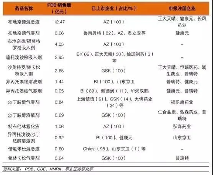 從以上數(shù)據(jù)可知,目前布地奈德混懸液、布地奈德福莫特羅粉吸入劑、沙美特羅替卡松粉吸入劑等重磅品種國(guó)內(nèi)僅原研獲批,市場(chǎng)份額完全被原研企業(yè)占據(jù)。國(guó)內(nèi)企業(yè)正在積極布局,一旦首仿成功,有望快速實(shí)現(xiàn)進(jìn)口替代。從已上市和研發(fā)布局情況來看,正大天晴、健康元、恒瑞醫(yī)藥、長(zhǎng)風(fēng)藥業(yè)、普瑞特、山東京衛(wèi)、仙琚制藥等處于領(lǐng)先位置。