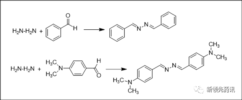 3)苯甲醛/對(duì)二甲基苯甲醛與肼反應(yīng)生成苯甲醛吖嗪/對(duì)二甲氨基芐連氮黃色化合物