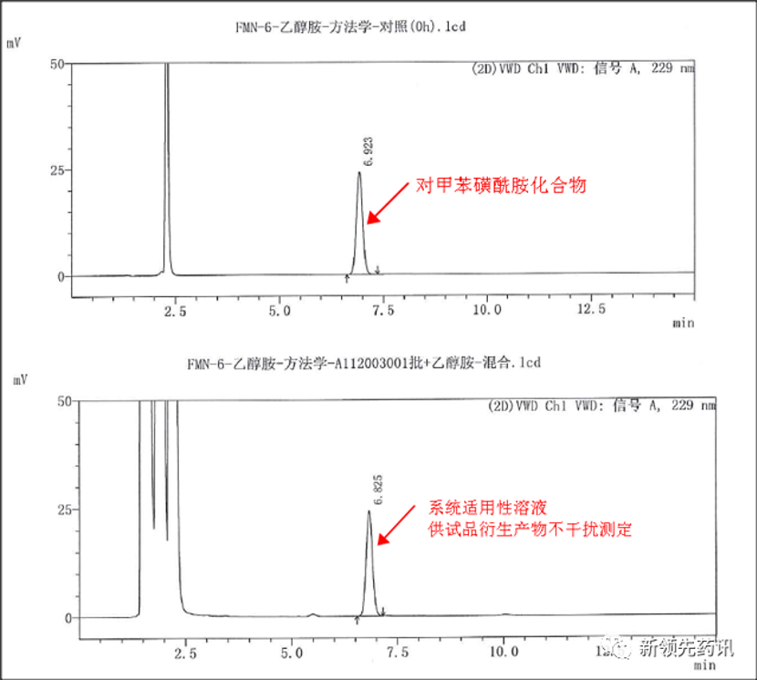 研究思路:需要對(duì)起始原料乙醇胺進(jìn)行研究,該化合物無紫外吸收,GC響應(yīng)較弱,結(jié)構(gòu)為伯胺,考慮采用對(duì)甲苯磺酰氯衍生生成對(duì)甲苯磺酰胺化合物,引入較強(qiáng)共軛,可采用HPLC進(jìn)行測(cè)定。
