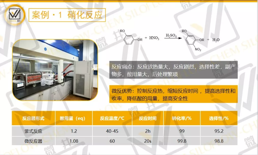 從實(shí)驗(yàn)角度來對(duì)比剖析相關(guān)參數(shù):在釜式實(shí)驗(yàn)中,為了保障反應(yīng)進(jìn)行,硝酸必須要進(jìn)行超量操作,在提升產(chǎn)品轉(zhuǎn)化率的同時(shí)必然導(dǎo)致廢酸和廢水的大量產(chǎn)生,而環(huán)保成本升高正在成為越來越困擾我們的一個(gè)桎梏。微通道反應(yīng)器可以將硝酸摩爾用量比值降到1.08,轉(zhuǎn)化率和選擇性更高。另一點(diǎn)在溫度的控制上,前期為了讓反應(yīng)安全,沒有在最佳溫度下進(jìn)行,而微通道以量小和本質(zhì)安全的優(yōu)點(diǎn),反應(yīng)溫度可以設(shè)定稍高一些,這也使得反應(yīng)時(shí)間大大降低(2h降到20s),對(duì)于實(shí)驗(yàn)室和生產(chǎn)現(xiàn)場(chǎng)的操作人員來說,這無疑是一個(gè)福音。