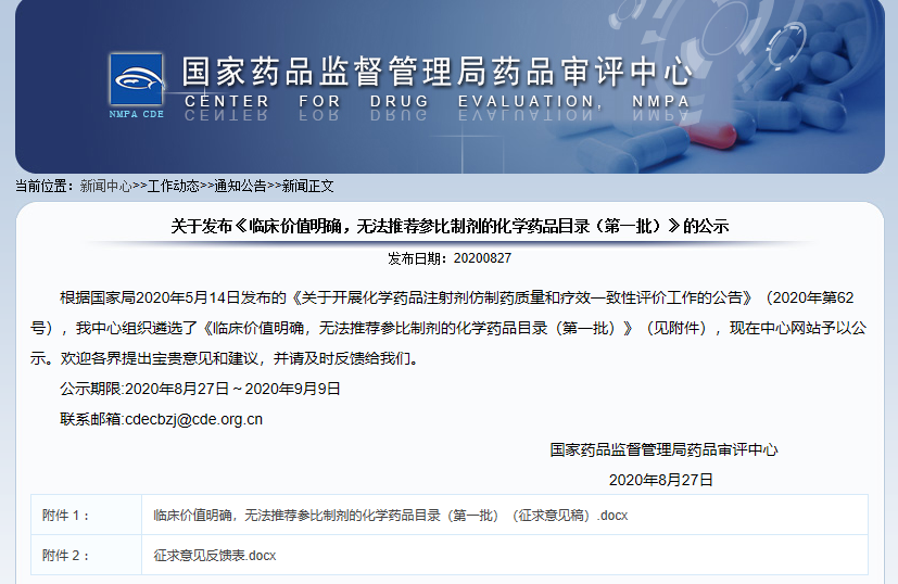 2020年8月27日,CDE發(fā)布《臨床價值明確,無法推薦參比制劑的化學(xué)藥品目錄(第一批)(征求意見稿)》(以下簡稱《目錄》),該目錄涉及注射劑40個、片劑25個、散劑3個、顆粒劑4個、膠囊劑4個、口服溶液10個,及其他劑型產(chǎn)品共計117個品種。