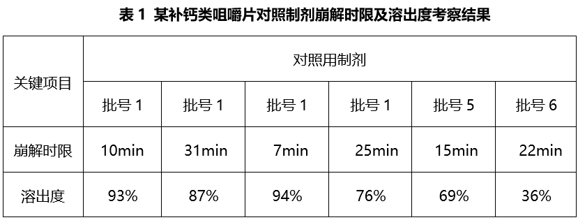 如對于《目錄》中的咀嚼片類品種,中國藥典通則中未對其崩解時限及溶出曲線作硬性規(guī)定,且各國藥典收載標(biāo)準(zhǔn)亦未將溶出度列入其質(zhì)量標(biāo)準(zhǔn)。某補(bǔ)鈣類咀嚼片,研究人員對主流國家上市的不同批次對照制劑進(jìn)行崩解時限及溶出度考察,結(jié)果表明崩解時限和溶出度的批間差異較大,六批對照制劑的崩解時限在7~30min不等,在鹽酸介質(zhì)中30min溶出度在36%~97%不等,相關(guān)數(shù)據(jù)見表1。
