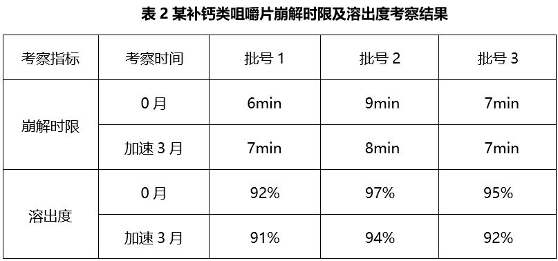 為有效的控制自制品的批間均一性及貨架期間穩(wěn)定性,為生產(chǎn)參數(shù)的制定提供依據(jù),同時保證咀嚼片在臨床使用期間由于部分人群咀嚼不完全導(dǎo)致臨床療效的差異,故推薦按照普通速釋片的崩解時限及溶出度標(biāo)準(zhǔn)確定咀嚼片的控制標(biāo)準(zhǔn)。參考USP<2040>相關(guān)規(guī)定將某補(bǔ)鈣類咀嚼片內(nèi)控崩解時限擬定為不得過30min,參考USP同品種普通速釋片劑將在鹽酸介質(zhì)中30min的溶出度擬定為不得過75%。對多批次自制品進(jìn)行考察,結(jié)果見表2。