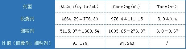 藥動學(xué)數(shù)據(jù),其中紅框內(nèi)的數(shù)據(jù)為細(xì)粒劑標(biāo)準(zhǔn)制劑的藥動學(xué)參數(shù):