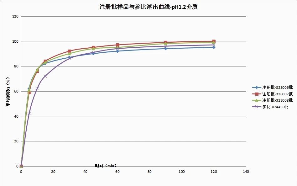 本品種仿制藥開發(fā)的過程,經(jīng)過逐級放大,工藝驗(yàn)證三批樣品在pH1.2介質(zhì)中的溶出略快于BE批次的參比制劑,三批樣品與參比的相似因子均未達(dá)到50,曲線圖如下: