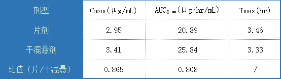 上表給出了給藥劑量均為200mg的前提下,片劑、糖漿、干混懸劑之間的藥動學(xué)參數(shù)對比,由于糖漿劑劑型比較復(fù)雜,受糖漿粘度影響,可能影響體內(nèi)吸收,暫不做考慮,單純對比片劑以及干混懸劑的藥動學(xué)參數(shù),如下: