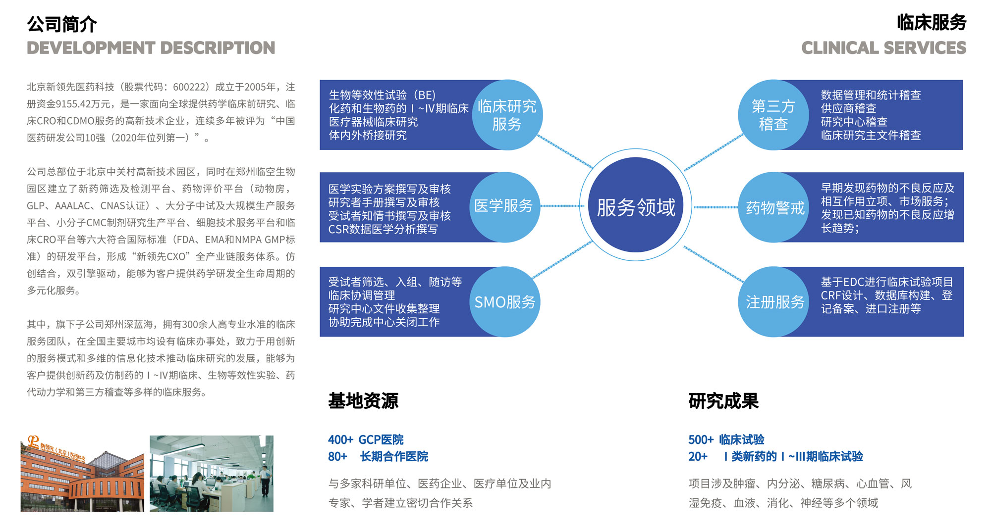 北京新領(lǐng)先(股票代碼:600222)成立于2005年,注冊資金9155.42萬元,是一家面向全球提供藥學(xué)臨床前研究、臨床CRO和CDMO服務(wù)的高新技術(shù)企業(yè),連續(xù)多年被評為“中國醫(yī)藥研發(fā)公司10強(qiáng)(2020年位列第一)”。公司總部位于北京中關(guān)村高新技術(shù)園區(qū),同時(shí)在鄭州臨空生物園區(qū)建立了新藥篩選及檢測平臺、藥物評價(jià)平臺(動(dòng)物房,GLP、AAALAC、CNAS認(rèn)證)、大分子中試及大規(guī)模生產(chǎn)服務(wù)平臺、小分子CMC制劑研究生產(chǎn)平臺、細(xì)胞技術(shù)服務(wù)平臺和臨床CRO平臺等六大符合國際標(biāo)準(zhǔn)(FDA、EMA和NMPA GMP標(biāo)準(zhǔn))的研發(fā)平臺,形成“新領(lǐng)先CXO”全產(chǎn)業(yè)鏈服務(wù)體系。仿創(chuàng)結(jié)合,雙引擎驅(qū)動(dòng),能夠?yàn)榭蛻籼峁┧帉W(xué)研發(fā)全生命周期的多元化服務(wù)。