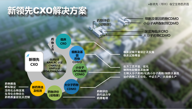 北京新領(lǐng)先公司依托既有的技術(shù)和管理團(tuán)隊(duì),整合鄭州臨空生物醫(yī)藥園平臺(tái),全面入資,建設(shè)并運(yùn)營(yíng)了“新藥篩選及檢測(cè)平臺(tái)、藥物評(píng)價(jià)平臺(tái)(動(dòng)物房)、大分子中試及大規(guī)模生產(chǎn)服務(wù)平臺(tái)、小分子CMC制劑研究生產(chǎn)平臺(tái)、細(xì)胞技術(shù)服務(wù)平臺(tái)、臨床CRO平臺(tái)”六大符合國(guó)際標(biāo)準(zhǔn)的技術(shù)服務(wù)平臺(tái),打通醫(yī)藥研發(fā)上下游產(chǎn)業(yè),新領(lǐng)先CXO體系多維度全方位賦能創(chuàng)新企業(yè)突破瓶頸高速成長(zhǎng),推動(dòng)醫(yī)藥行業(yè)加速發(fā)展。