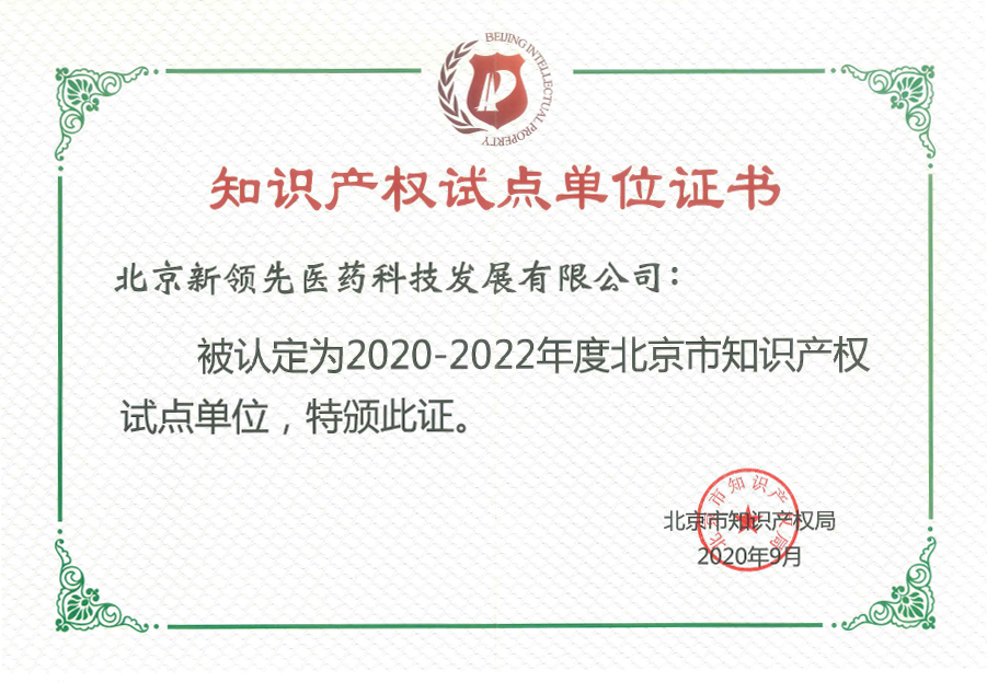 喜報(bào):北京新領(lǐng)先醫(yī)藥科技發(fā)展有限公司榮獲北京市知識(shí)產(chǎn)權(quán)試點(diǎn)單位認(rèn)定