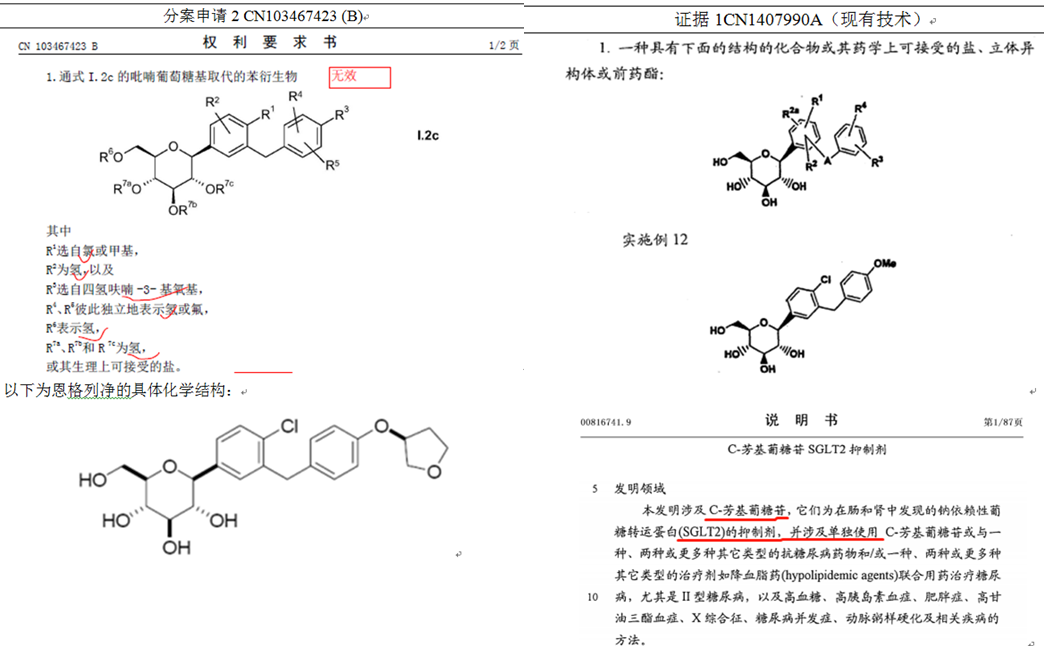 ? 分案3:581B,無效請求人為個體,最終結(jié)果為權(quán)1無效,權(quán)2維持有效。部分無效后的分案581B只保護制備方法,不再保護恩格列凈的化合物。本專利的權(quán)利要求1被無效的理由同分案423B。