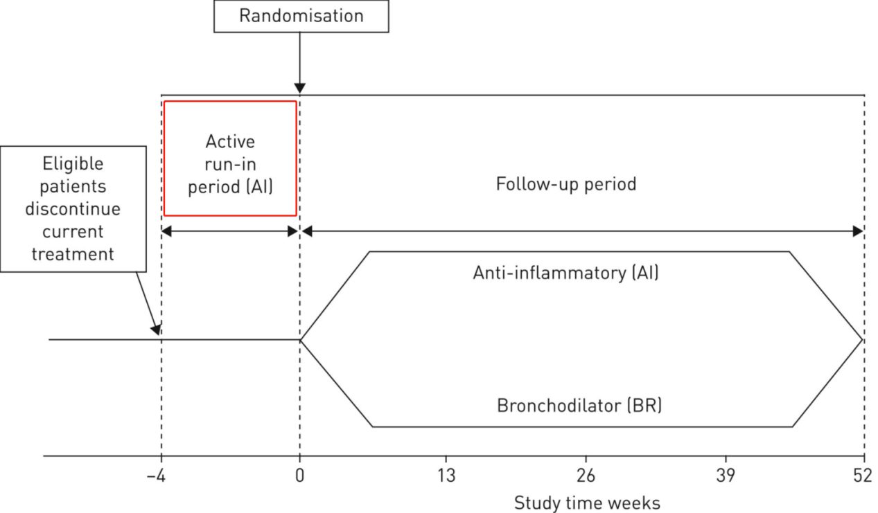 ▲ 比較抗炎藥(AI)與支氣管擴張劑(BR)有效性的隨機對照試驗,試驗藥物治療之前受試者先進入為其4周的導(dǎo)入期
