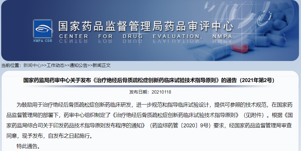 關(guān)于發(fā)布《治療絕經(jīng)后骨質(zhì)疏松癥創(chuàng)新藥臨床試驗(yàn)技術(shù)指導(dǎo)原則》的通告(2021年第2號(hào))