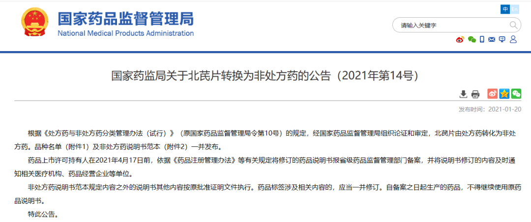 關(guān)于北芪片轉(zhuǎn)換為非處方藥的公告(2021年第14號(hào))