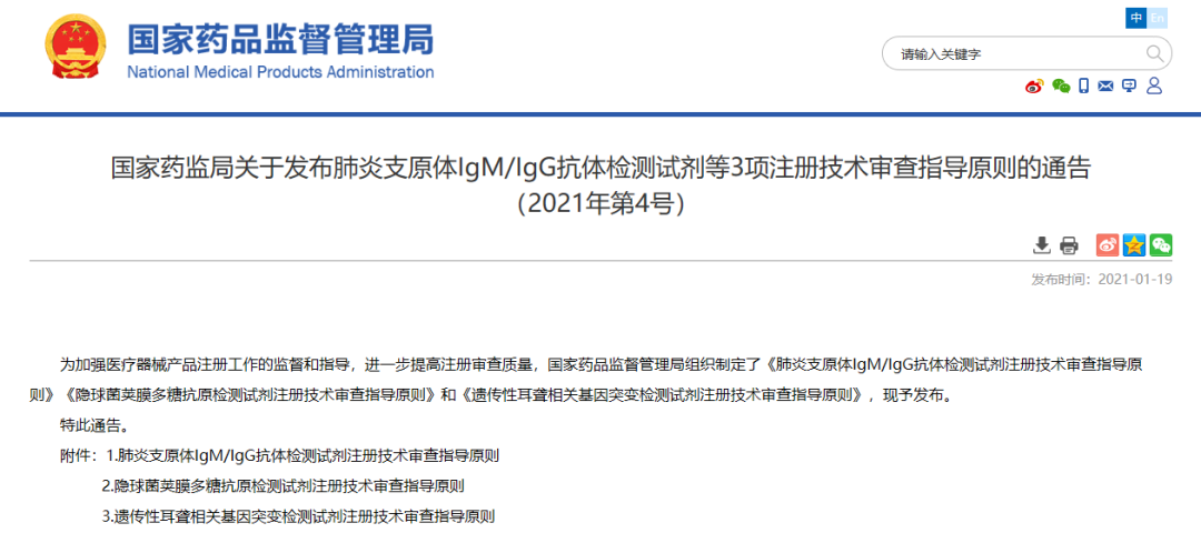 關(guān)于發(fā)布肺炎支原體IgM/IgG抗體檢測(cè)試劑等3項(xiàng)注冊(cè)技術(shù)審查指導(dǎo)原則的通告 (2021年第4號(hào))