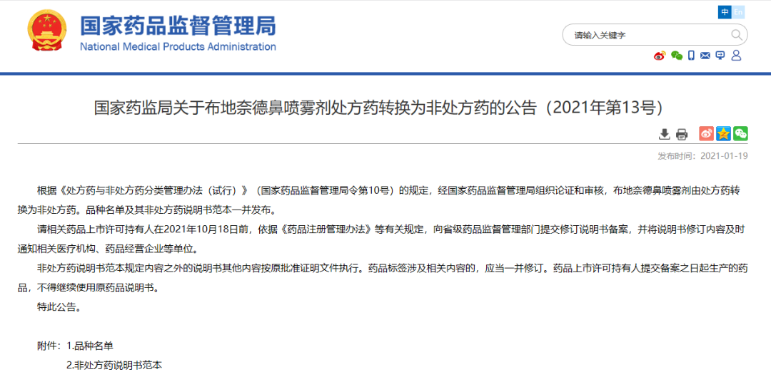 關(guān)于布地奈德鼻噴霧劑處方藥轉(zhuǎn)換為非處方藥的公告(2021年第13號(hào))