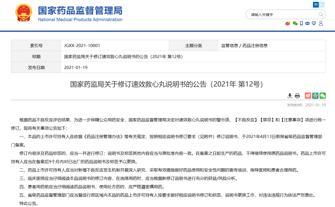 關(guān)于修訂速效救心丸說(shuō)明書(shū)的公告(2021年 第12號(hào))