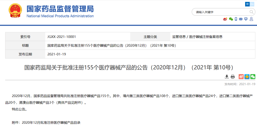 關(guān)于批準(zhǔn)注冊(cè)155個(gè)醫(yī)療器械產(chǎn)品的公告(2020年12月)(2021年 第10號(hào))